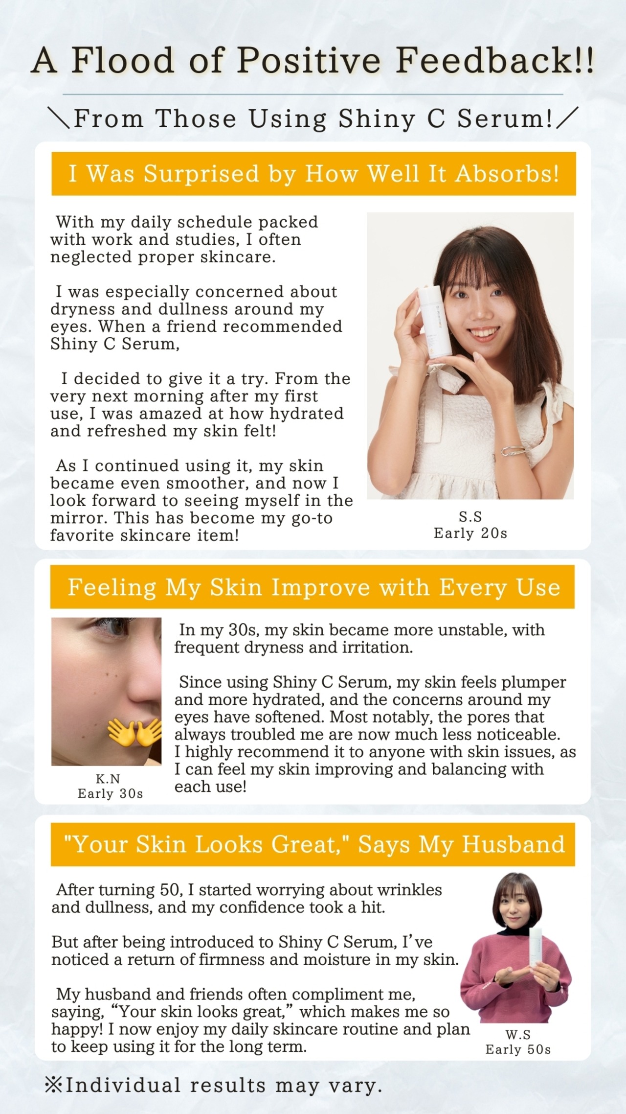 Shiny C Serum brings professional-level care to your home through the power of “at-home beauty(Ouchi-Biyou)”. With just one bottle, it unlocks your skin’s natural radiance, guiding you toward the ideal glow of kagayaku skin.